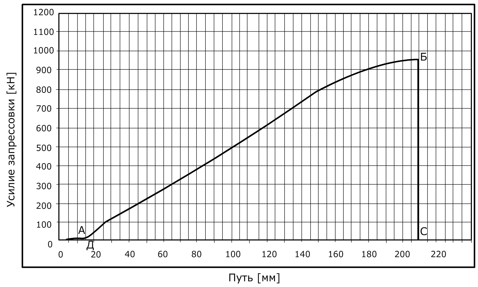 – точка А соответствует началу фактического прессования, при этом начальное усилие запрессовки отсчитывается с момента преодоления силового порога, установленного в 29 кН (3 тс);
